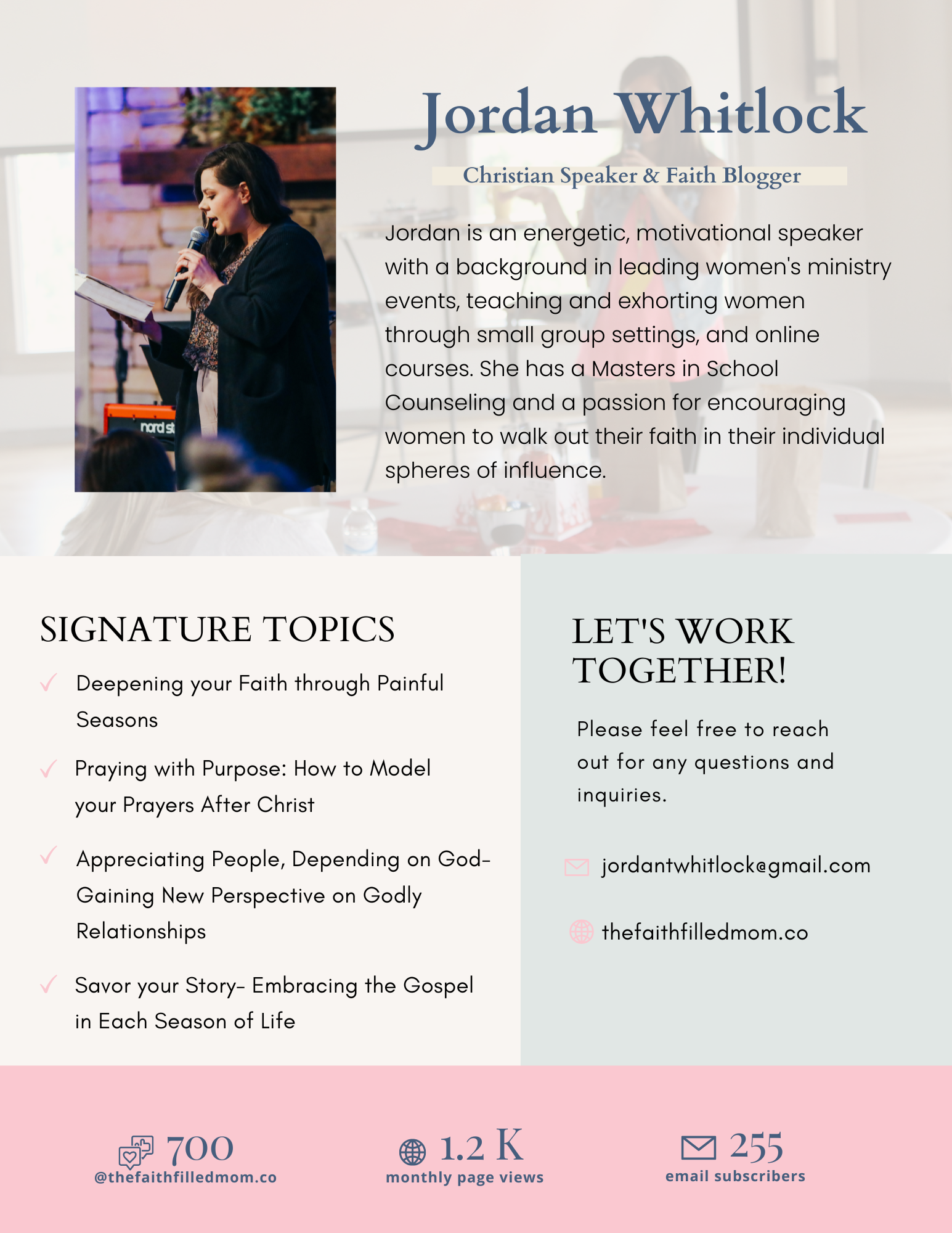 Currently Booking for events in 2025/2026. Submit and inquiry form below and someone will be in touch within 48 hours. Jordan also speaks on topics outside of her signature topics, and can adapt to what your church's event theme is.